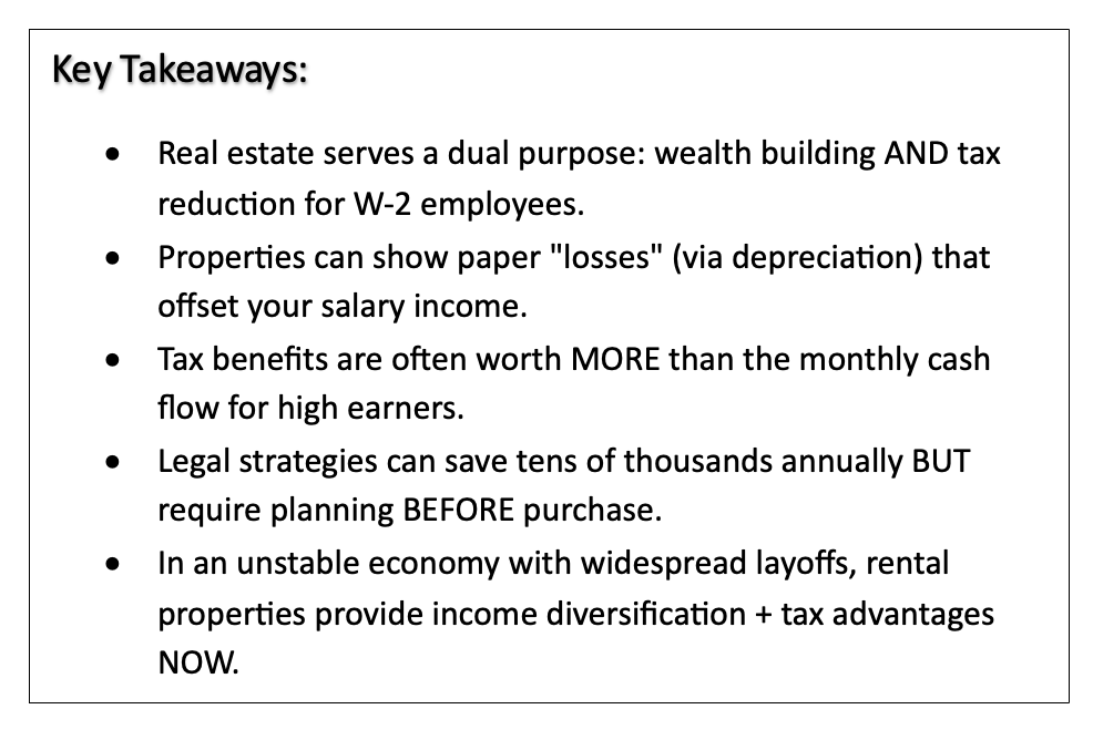 What Most Don’t Realize is that Real Estate Serves Two Purposes:Building Wealth (the obvious part) Tax Engineering (the part nobody talks about)