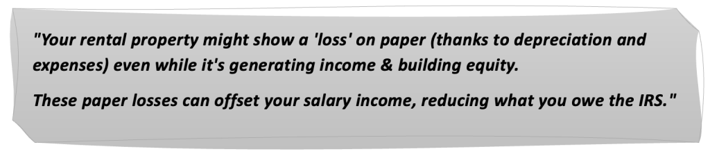 Did You Also Know: Your rental property might show a “loss” on paper (thanks to depreciation and expenses) even while it’s generating income and building equity. For high-income W-2 employees who qualify, these paper losses can offset your salary income, reducing what you owe the IRS.